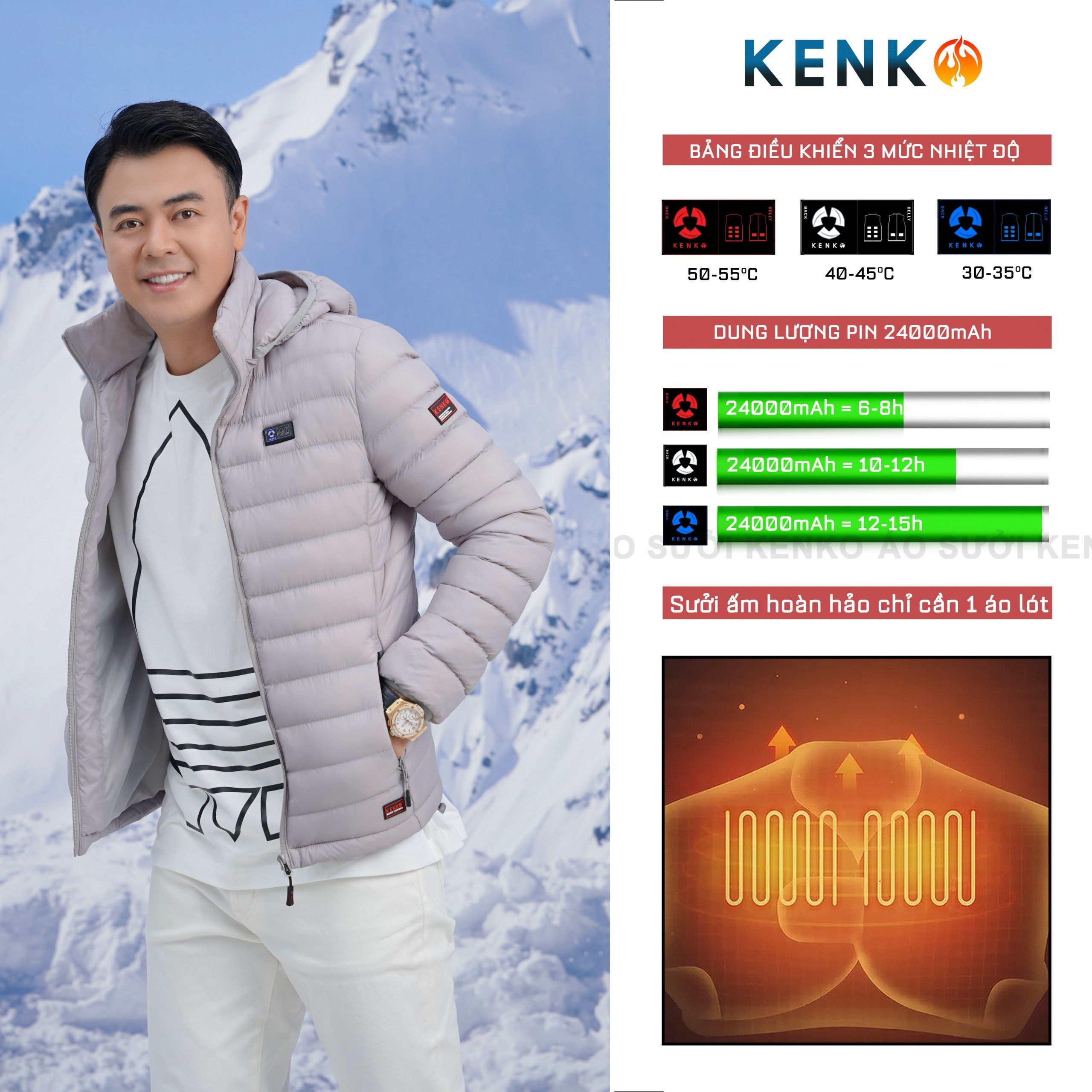 Áo khoác sưởi ấm Nhật Bản Kenko J08 siêu ấm, màu xám bán rời ( Không có Pin + Dây Cáp + Sạc )
